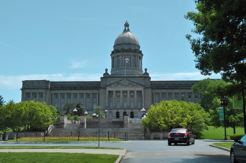 Stan Kentucky.O godzinie 11-tej przejeżdżamy przez most nad Ohio i jesteśmy w stanie Kentucky (rzeka jest granicą). Autostradą 75 (póżniej 64 na zachód), znikamy między pagórkami coraz większymi w stronę stolicy tego stanu niewielkiego miasta Frankfort. Nie mylić z Frankfurtem w Niemczech. Cały stan ma populację nieco ponad 4 miliony. Większymi miastami od stolicy są: Lexington- Fayette, oraz Louisville. W stolicy przeważa zabudowa niska z kolorowymi budynkami sprzed wieku. Przez środek starego miasta wiedzie linia kolejowa. Miasto także położone jest wokół zakoli rzeki tutaj jest to rzeka Kentucky.