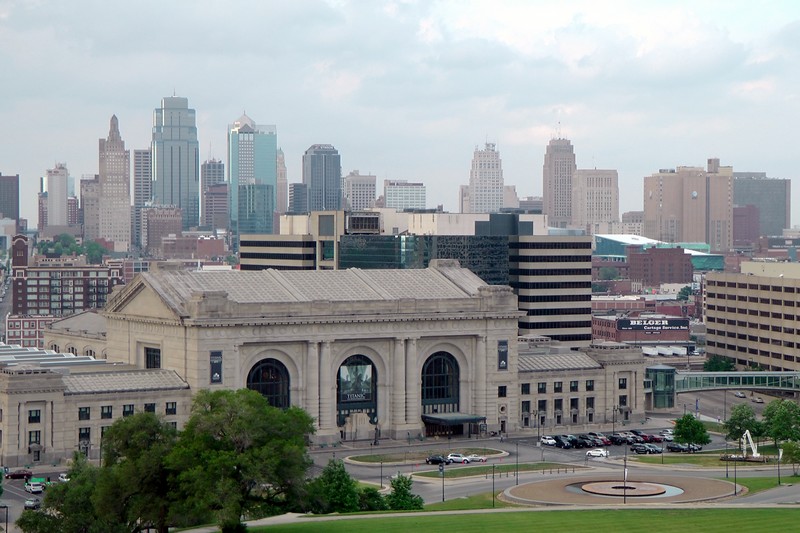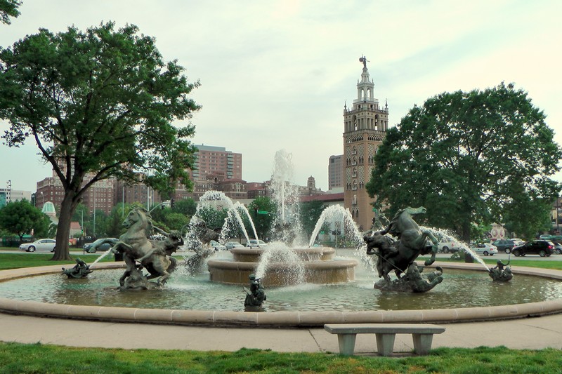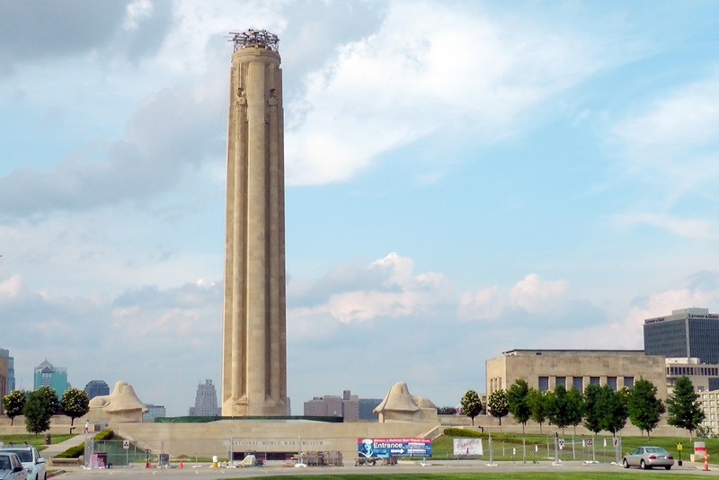 Trzy godziny jazdy dalej wśród prerii ze stadami krów w pobliżu wodopojów, jesteśmy nieco zmęczeni w Kansas City. Duże 1,8 mln. miasto leży w stanach Kansas i Missurii. Centrum i stare miasto jest poza Kansas. Aby dojechać do naszego motelu nr 6 przy międzystanowej I 26 (interstate 26), przejeżdżamy w pobliżu centrum, i wierzcie mi nie zdołałem nic sfilmować. Te autostradowe skrzyżowania kilku szybkich dróg na krótkim odcinku, przypominało mi kłębowisko makaronu. Kilka dróg pod i nad sobą, które przejeżdża się z pełna prędkością. Późnym popołudniem spaceruje po centrum. Oglądam Arabia Steamboad, statek, który w 1858 r. zatonął na Missurii z towarami dla osadników, i zatopił się w mule. W 1980r wydobyto go i pokazano w tym muzeum. Wrażenie robi, chyba jedyny jaki widziałem, pomnik ofiar I wojny światowej. Spod tego pomnika rozciąga się wspaniała panorama miasta.