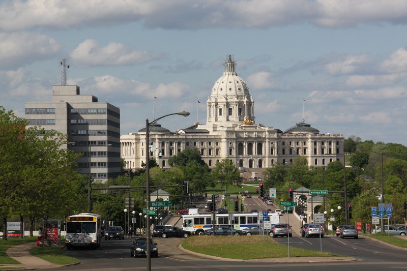 Minnessota. Jedziemy bardzo szybko przez rozległe żyzne tereny pocięte na duże pola. Kolejne 4 godziny jazdy po J 94 i jest stolica Minnessoty, którą faktycznie są dwa miasta: Minneapolis oraz St. Paul, rozłożone po przeciwnych stronach rzeki Missisipi. Mówi się o nich bliźniacze miasta. Kiedyś napływający tu Skandynawowie i Niemcy uprawiali ziemię i ziarno przywozili do miast do zmielenia. Obecnie to duże miasta niewiele mające wspólnego z rolnictwem. Zwiedzamy piękna katedrę im Św. Pawła w St. Paul, która jest replika Bazyliki Św. Piotra z Rzymu. Jeszcze tylko rzut oka na centrum obu miast i znowu nasz hotel. Tym razem dzień kończymy przed 18.00, pomimo pokonania ponad 700 km.