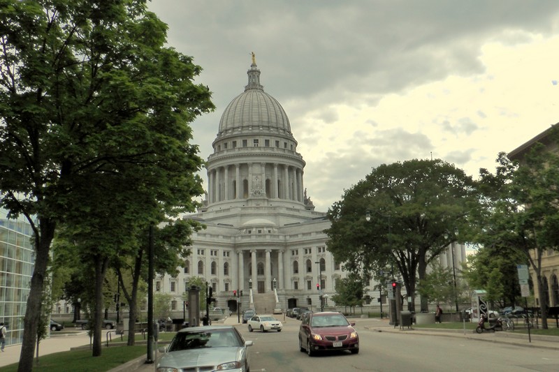 Jeszcze tylko godzina dalej na J 94 i jesteśmy w stolicy Madison. Jest małym miastem, i jak to tu bywa mimo że jest stolicą, wcale nie jest największym ośrodkiem miejskim. Miasto jest ładnie położone pomiędzy w przesmyku pomiędzy dwoma wielkimi jeziorami: Mendota i Monona. Ma ładny górujący nad okolica, i z daleka widoczny, Kapitol Stanowy z dużą wysoką kopułą i trzema skrzydłami. Tuż obok centrum ładne domy w wiktoriańskim stylu.