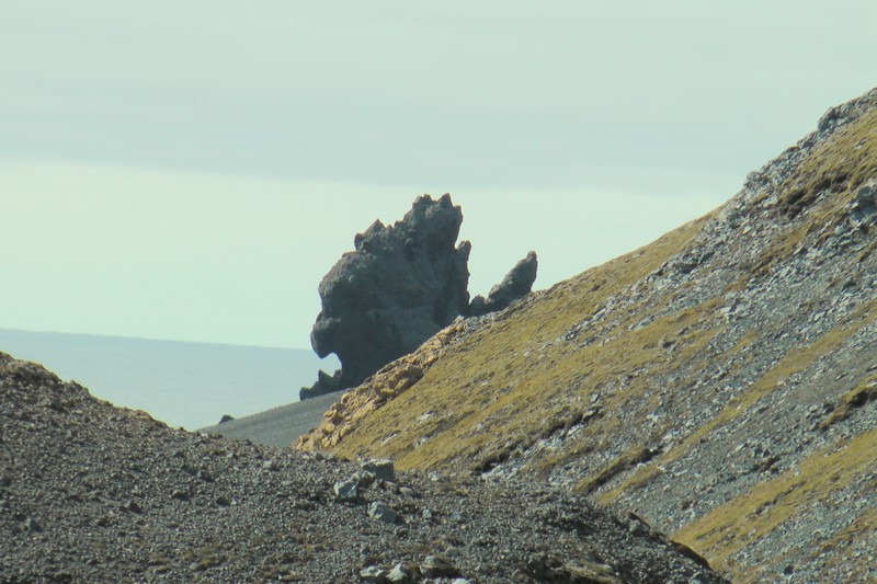 Kilka godzin na wędrówce przez Jan Mayen z licznymi postojami, z co chwilę zmieniającymi się pustynnymi wulkanicznymi krajobrazami, zakończyłem po południu w dawnej osadzie Puppebu, w zatoce Raabynubben. Wysokie klify z obu stron są usiane masowo gniazdami kilku gatunków ptaków, a na plaży zalegają kłody drewna przyniesionego przez ocean i historyczne resztki działalności myśliwych i wielorybników.