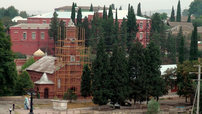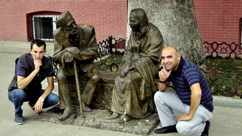 Rankiem następnego dnia kolejna marszrutka z Sheki do Gandży (150 km, 3 godziny, zaa 3 M). Wysadza mnie przy bramie wjazdowej do miasta od strony Baku w poblizu Yevlax Av. (Jewlawskij Abtowokzał). Z przygodnie spotkanym Mechtanem jadę inna marszrutką do placu centralnego i pytam o hotele. Wybieram nieco dalej w centrum hotel Kepez (20 M/noc: 6 piętro, pokój z c. woda w stanie do kapitalnego remontu, hotel typu d. Inturist). Ok. 11 idę zobaczyć skąd i jak pojechać jutro dalej w stronę Gruzji przez przejście Krasny Most. Możliwości dwie: z Yevlax Av ok. 9.00 jedyny bus do Marnauli (miasto za Tbilisi) za 4 M-4 godziny, i z drugiego dworca Nowa Gandża 110 km do Kazax i dalej 25 km na granicę. Jeździłem między dworcami marszrutkami (za 0,2M). Łatwo pytać starszych wiekiem po rosyjsku. Przesiadałem się pomiędzy tymi wiekowymi pojazdami (zwykle stare busy towarowe z wstawionymi wokół na „pace”wokół ławkami), na niedzielnym dużym bazarze: barwny, sporo owoców, kury powiązane za nogi, stoiska np. tylko z czarnymi butami, i wesołe pogaduszki ze sprzedawcami. Próbuję wędzonego sera typu nasz oscypek. Na obiad 2 duże pierogi nadziewane baranim mięsem+ kola za 0,8 M (jeden wystarczyłby). Zabytki zacząłem zwiedzać od dużego centralnego placu tego 2-go pod względem wielkości miasta Azerbejdżanu. Na centralnym budynku monumentalna podobizna m. innymi prezydenta Heydara Alieva, z boku placu również jego pomnik. Wokół potężne reprezentacyjne budynki miejskie, w tym wyróżniająca się rzeźbami na froncie filia Akademii Nauk. Na budynku Uniwersytetu bilbord przypominający o 870 rocznicę związanej z wybitnym obywatelem miasta poetą- pisarzem Nizamim. Z drugiej strony placu znajduje się XVII wieczny Kompleks Bahaudina. W jego składzie : z 17 metrowa kopułą z 2-ma minaretami, zbudowany z czerwonej cegły Meczet Dżuma (lub Szach Abbas), oraz budynek łazni Czejak Haman (od 2002 na liście Unesco- był nieczynny). Inne zabytki miasta: w uliczce poprzecznej do placu karawanseraj (remont- niedostępny), i ok. 7 km od miasta Grodzisko Gandża (odradzono mi, od lat niezamieszkane i niewiele z niego zostało). Jest tez Mauzoleum Nizamiego.