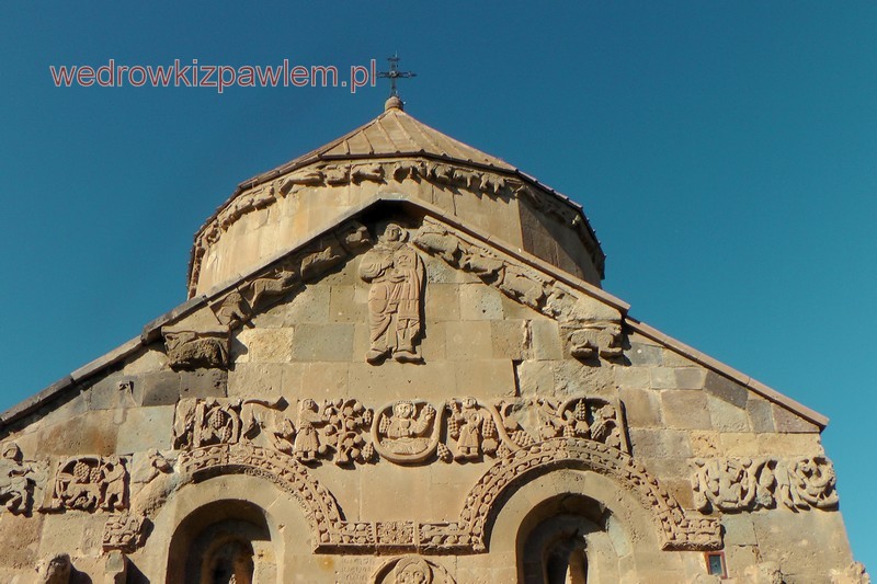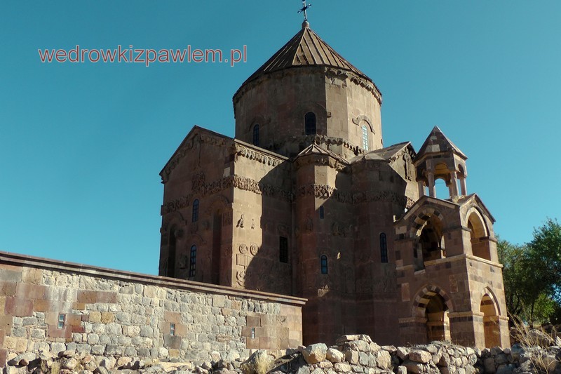 Jest już 15 października. Mam nieco czasu wiec postanowiłem zwiedzić Akdamar tanio. Po 7-j wyszedłem z hotelu na bliski terminal mini busów. Jest obok skrzyżowania z pomnikiem z rybami. Tam siedzę w busiku i nic się nie dzieje. Podchodzi starszy Kurd i zaprasza na śniadanie do knajpki obok. Jestem po śniadaniu w hotelu, ale co mi tam, ogrzeję sobie nos herbatą,bo nieco chłodnawo choć słonecznie. Razem z kierowcą busa ciepły placek chlebka popijam „czajem” . Zapraszający gospodarz okazał się właścicielem busa, i za pół godziny kasuje moje 2,2 USD za bilet do Gevas (44 km- 50 minut). W miasteczku Gevas przesiadam się na następnego busa, i za 6km ( 0,6 USD) jestem na przystani łodzi wycieczkowych na wyspę Akdamar. Wyspa jest oddalona o 4 km od brzegu (bilet w obie strony za 6,7USD). Na wyspie zwiedza się kościół chrześcijański ormiański Św. Krzyża z X wieku. Jest to pozostałość po klasztorze, wybudowanym przez króla dawnego państewka Vaspurakan Gapika I. Klasztor był przez kilka wieków siedzibą katolikosa- patriarchy kościoła ormiańskiego.