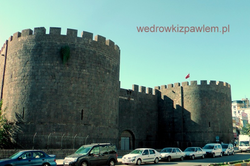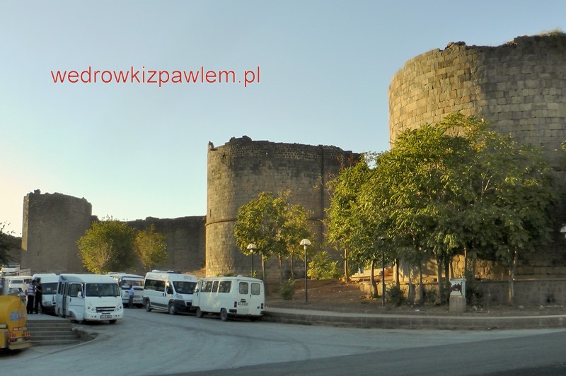 Wracam także minibusami i jestem w południe w Van. Szukam autobusu nocnego do następnego miasta na mojej trasie: Diyarkabir. Znalazłem w biurze firmy autobusowej w pobliżu skrzyżowania z rybami: trasa ma 328 km , 7 g. jazdy, za 11 USD. Pół godziny wcześniej zabierają pasażerów z biura w centrum, na nieco oddalony od niego dworzec autobusowy (otogar). W okolicy Van można jeszcze zwiedzić Zamek Hosap (55 km, odpuściłem). Ogląda się go wyłącznie z zewnątrz, gdyż nie jest udostępniony zwiedzającym. Opuszczam to szybko rozbudowujące się miasto, w który co krok spotykałem w centrum kawiarenkę internetową, ale i ulicznych sprzedawców papierosów (również na sztuki). Wydawać by się mogło, że ta kraina- Anatolia: gdzieś tam daleko w Azji Mniejszej, gdzie leży ten Ararat?, w jakim kraju?… (dużo by można jeszcze takich potocznych pytań), jest krainą… gdzie jeździ się na osiołkach. Nic bardziej błędnego. Tutaj jest zwyczajne nowoczesne miasto w stylu prawie europejskim. Patrzeć tylko trzeba pod nogi idąc chodnikiem, aby czegoś sobie nie złamać, lub nie spaść z wysokiego na ok. 30 cm krawężnika. A, zapomniałbym, spotkałem fachowca elektronika, który naprawił mi nierozbieralny akumulatorek kamery za śmieszne grosiki. Rozciął, polutował i skleił z powrotem (150 USD zostało w kieszeni). U nas odpowiedź jest jedna: takie rzeczy proszę Pana się nie naprawia, tylko wymienia! Faktem jest także to, że nie widzę innych turystów obcokrajowców, lub niezwykle rzadko. Dotychczas spotkałem tylko parę Francuzów. O 5-tej rano 16 października jestem na skraju miasta Diyarbakir. Dworzec autobusowy Yeni Otgar jest w odległości ok. 8 km od centrum tego ponad 600 tysięcznego miasta. Czekam aż się rozwidni i po siódmej dojeżdżam dolmuszem (0,8 USD) do centrum miasta na ulicę Kibrisi Cad. Wybieram Hotel Malkoc (19,3 USD/pokój 2 os.). Ta ulica to praktycznie same hotele, niestety w takiej i wyższej cenie. Miasto jest stare i posiada historię sięgającą aż 2000 tysięcy lat p.n.e. Leży w dolinie rzeki Tygrys. Znajdowało się na Jedwabnym Szlaku. Było potężną twierdzą noszącą dawniej nazwę Amidy Obecnie nieoficjalnie nazywane jest stolicą Kurdystanu. Turcy nie lubią tego określenia, gdyż nie tak dawno było areną walk pomiędzy PKK (Partia Pracujących Kurdystanu), a turecką armią. Duże miasto, ale z atmosferą prowincjonalną. Bardzo sympatyczne miejsce do zwiedzania. Bardzo dużo zabytków w większości z okolic XVI wieku. Potraktowałem ten dzień wypoczynkowo, a mogłem to zrobić gdyż około 90 % zabytków mieści się na starym mieście, otoczonym wysokim bazaltowym murem obronnym. Wszystkie odwiedzone miejsca miałem w odległości przyjemnego spacerku brukowanymi uliczkami, gdzie byłem chyba jedynym turystą obcokrajowcem. Budziłem duże zainteresowanie i cieszyłem się chyba sympatią, gdyż nieustannie byłem zapraszany na czaj i to co zapraszający miał do niego. Zwiedzanie rozpocząłem od XI wiecznych murów obronnych, którą wybudowano na fundamentach umocnień rzymskich i bizantyjskich. Owal murów ma średnice ok. 1,6 x 1,1 km, z obwodem sięgającym 6 km . Mury posiadają 4 główne bramy i 72 obronne wieże.