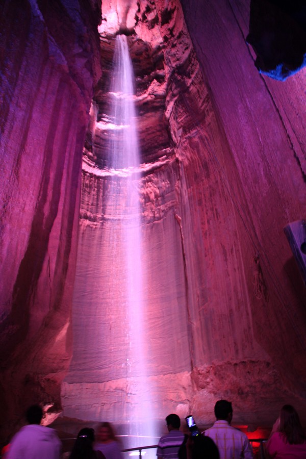 Zjeżdżamy w dół i zjeżdżamy ok. 100 m.(260 stóp) windą w dół do wnętrza góry, aby zobaczyć , jak mówia amerykanie : jeden z siedmiu cudów natury USA, podziemny wodospad Ruby Falls. Dociera się do niego idąc podziemnymi ciasnymi 740 metrowymi chodnikami, wykonanymi w rozpadlinie we wnętrzu Lookaut Montain 330 metrów pod ziemią. Chodniki wiodą przez wąskie wysokie miejsca przyozdobione stagtytami i stalagmitami do 44 metrowego wodospadu. Woda spada w dół pionowo z sufitu groty. Na pewno ten podziemny wodospad utkwi mi w pamięci, choć nie polecam go osobom cierpiącym na klaustrofobię, lub nie lubiącym zwiedzania w tłumie turystów. Niedaleko groty z wodospadem jest najbardziej stroma kolejka na świecie, którą można wjechać na górę.