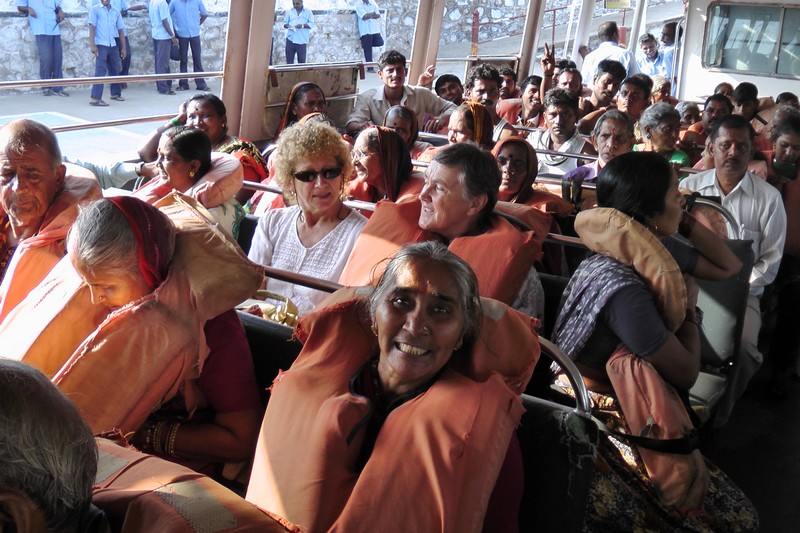 do lewej wysepki z zbudowanym tutaj w 1970 r. Vivekananda Rock Memorial (dwie małe świątynie hinduskie). Wraz z nami podróżuje liczny wielobarwny tłum wiernych. Z wysepki jest widok na cały rejon miasta Kanyakumari , w tym mały port rybacki, i duży zbudowany