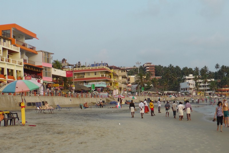 Po południu kurort Kovalam ze swoimi wysokimi skałami nadmorskimi, i piaszczystymi plażami pomiędzy nimi. Nasz hotelik tuż obok latarni morskiej, jest przylepiony do skał, kilkanaście metrów nad dużymi falami, rozbijającymi się z hukiem o brzeg. Nazywa się „Mini House” Guest House. Ładne miejsce z pięknym widokiem, z tarasu pokoju i restauracyjki, choć nieco głośne, zwłaszcza w nocy. Po południu spacer po głównych plażach Kovalam, z piwkiem i małym