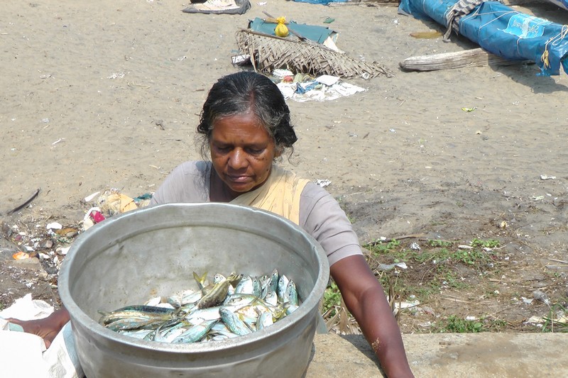i rybek pomiędzy pracujących. Wokół tej plaży na krawędzi plaży i skał, tylko kryte palmowymi liśćmi parterowe restauracyjki, wieczorem oferujące wcześniej kupione na plaży ryby.