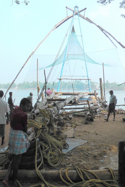 Czekając na autobus w Fort Kochi, obserwowałem połowy ryb, przy pomocy chińskich sieci. Jest to rodzaj dużego kwadratowego saka z sieci, zanurzanego w wodzie na dno, przy pomocy przedziwnego systemu drewnianych belek,