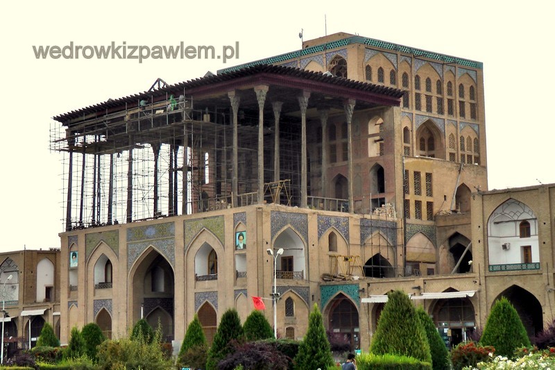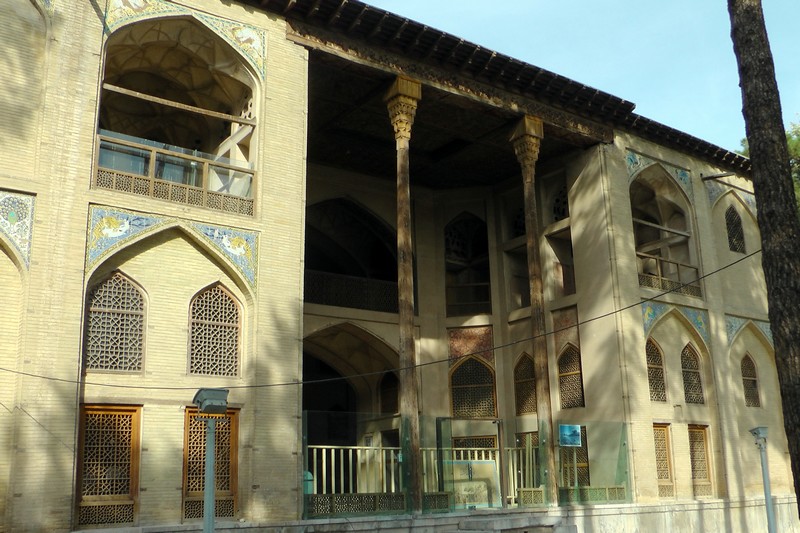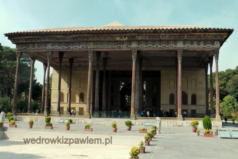 Większość pozostałych zabytków w zasięgu spaceru. Odwiedzam kolejno: Pałac Chehelsotun- tzw. Pałac 40 kolumn. Fizycznie istnieje tylko 20, pozostałe są odbiciem ich w płytkiej wodzie sadzawki przed pałacem. Pałac Hasht Behesth jest nieco zniszczony. Oba pałace zbudowano w ogrodach.