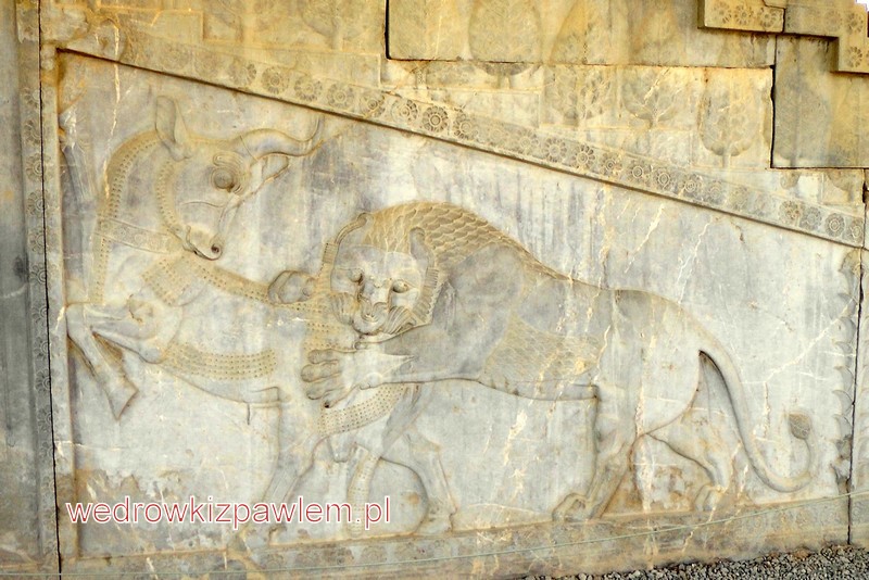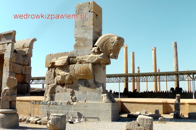 Powrót był szybki nie licząc stopu przy sklepie, z pysznymi dojrzałymi ciemno czerwonymi granatami. Nie wiadomo kiedy jest po 20-j, i mój dworzec autobusowy. Kupuję na 21,30 bilet na VIP-a do Shiraz (570 km-9,5 godz.-4,6 USD). Siódmego października Very Important Passenger (VIP), już o 6.00 obudził się na dworcu w Shiraz. Tak szybko minęła noc! Zabrałem swoje zabawki i wio na dworzec pomyśleć co dalej. O 7-j miałem już zaplanowane następne 2 dni. Nocleg w Shiraz jeden, i potem przeskok kolejny do Isfahanu (kupiłem Vip-a- spodobał się moim kościom, znowu 4,6 USD za 560 km). Taxi (za 1 USD) do hotelu Saadi w centrum (8,3 USD/pokój 2 osobowy). Taki sobie. Zostawiam bagaż i jadę na wycieczkę do starożytności w … słynnym Perespolis (taxi 10 USD-60 km). Na teren ruin nie można wnosić większego bagażu (jest przechowalnia). Wstęp 0,17 USD, bez muzeum – nieczynne. Zwiedzam te ruiny starożytnej stolicy Persji. Istniała od 518 r. p. n.e. i olśniewała swoja świetnością do roku 330 p.n.e., kiedy to zdobywca Aleksander Wielki, kazał je podpalić (podobno pod wpływem alkoholu i kobiet). Z pałaców Dariusza I Wielkiego zostały wyłącznie ruiny, w których obecnie interesująca jest: brama Wszystkich Narodów, z 2-ma skrzydlatymi bykami, wysokie kolumny sterczące z innych budowl