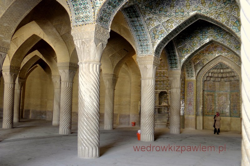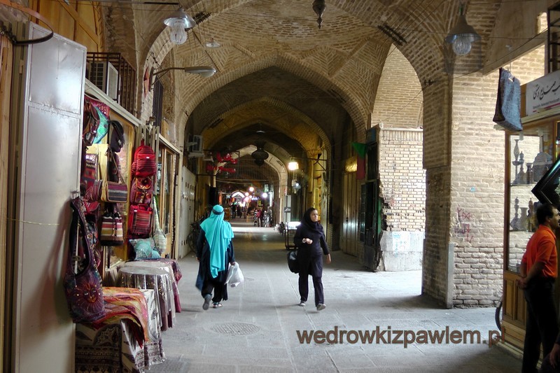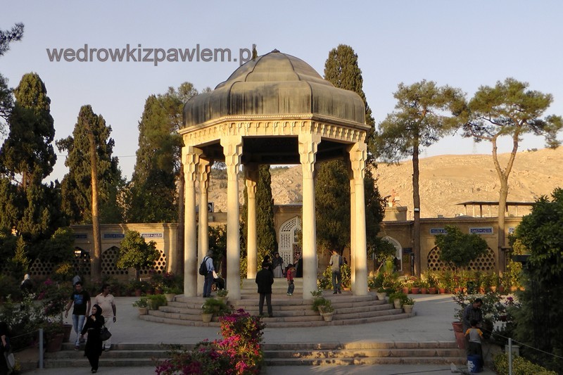 Wracam na bazar i po pół godzinie wolnego spaceru pomiędzy sklepami i straganami, jestem w mieszczącym się na nim Meczecie Vakil (wstęp 0,5 USD). Interesująca sala główna z kamienną kolumnadą. Zrobiło się popołudnie. Postanowiłem zobaczyć jeszcze Mauzolea za rzeką. No i zanim tam trafiłem… minęło 2 godziny. Szedłem „na czuja” , tylko nie zwróciłem uwagi że te uliczki mocno zakręcają. W końcu zadowolony widzę rzekę … bez kropli wody, a za nią ładną kopułę Mauzoleum Alego ebn- e Hamze ( bez opłat). Ładne lustrzane wnętrza. Trochę dalej za parkiem Mauzoleum największego irańskiego poety Hafiza. Irańczycy go uwielbiają i znają jego utwory. W Mauzoleum sarkofag poety stoi pod dachem z kolumnami. Wokół na zadaszonych tarasach mnóstwo cytatów (niestety tylko w perskim). Zauważyłem sporo młodych Irańczyków obojga płci