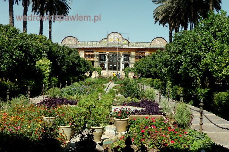 Idę jednak dalej bo i tak do kolejnych miejsc turystycznych, muszę przechodzić przez bazar ( a właściwiej bazary). Jestem przy XIX wiecznym Meczecie Nasira ol Molka (wstęp 0,5 USD). Z zewnątrz nieciekawy, ale za w środku bogate zdobienia. Wchodzę wszędzie robiąc zdjęcia. W pobliżu znajduje się niewielki Ogród Naranjestan (Pomarańczowy). Wewnętrzny dziedziniec obsadzony drzewami pomarańczowymi. W drugim końcu ogrodu znajduje się pałac szachów z dynastii Kadżarów (wstęp 1 USD, cena obejmuje muzeum pałacowe).