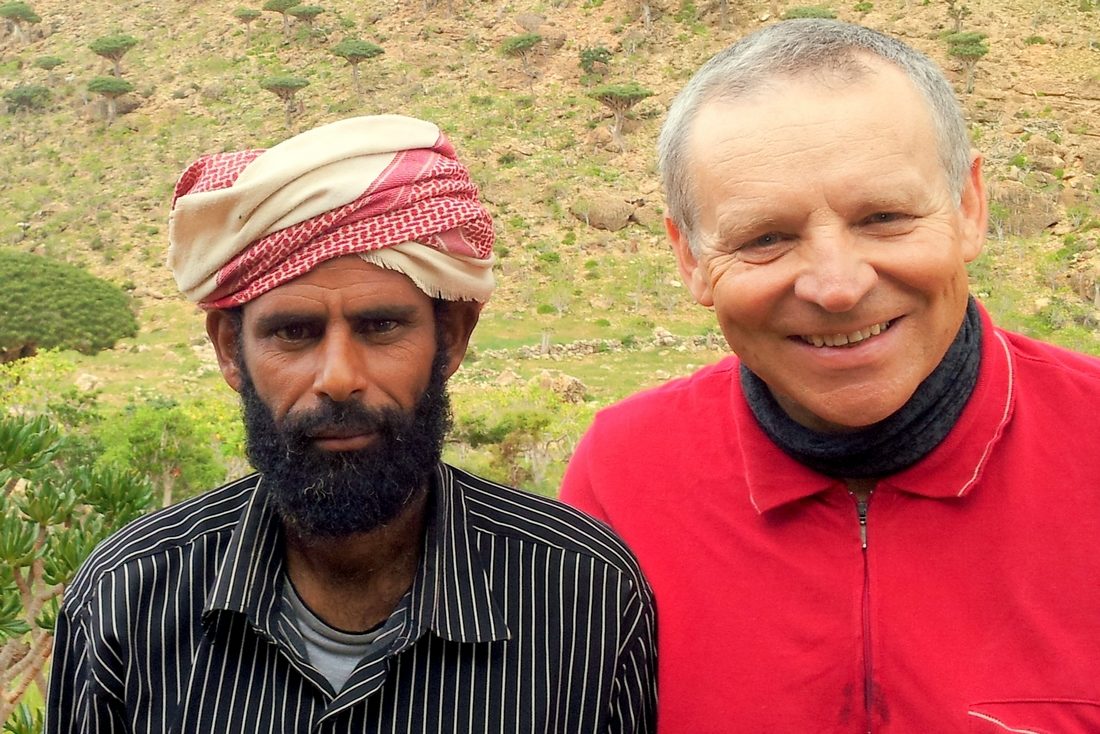 Nasz ostatni dzień w górach Socotry spędziliśmy idąc z płaskowyżu Homhil w dół w kierunku wybrzeża. Prowadzi nas brodaty przewodnik Amer (na  zdjeciu Amer i autor tej relacji).Z lewej na zboczu gęsto od parasoli (grzybów) drzew smoczej krwi. Nucę pod nosem piosenkę: „parasolki, parasolki… bardzo tanie…”  zwłaszcza, że po raz pierwszy na Socotrze kropi deszcz. Biorę do plecaczka swoją pelerynę i ruszamy w dół korytem okresowej rzeki. Jest to kanion z wysokimi zboczami. Podziwiam niezwykłe kształty, które natura wyrzeźbiła na dnie tego górskiego suchego potoku. Wychodzimy na potężną bramę przez jakby wyłom w klifach z obu stron, gdzie potok spada w dół. My się nim cofamy i trawersując to potężne zbocze, pod wysokimi pionowymi skałami schodzimy w dół. Spotykamy kilka drobniejszych odmian drzew i krzewów. Podziwiam potężne konary drzewa  African Asturcalu (nie znam polskiej nazwy). Na dole hop do samochody, który w czasie naszego marszu w dół objechał ją dookoła.