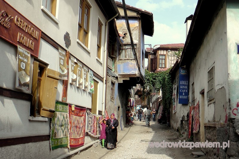 Muzeum Etnograficzne (wstęp 2,8 USD) jest niewielkie, i prawdę mówiąc… nie jest godne polecenia. Poszedłem pod górkę w kierunku Twierdzy Ankara (Kalesi) i trafiam na bazar. Najpierw był to „pchli targ ze starociami: „ szwarc mydło i powidło”. Zjadłem kebab i dalej już bazarowe sklepy : tańsze droższe, z mnóstwem ludzi. Sklepy dla miejscowych, nie ma turystycznego… chłamu. Co chwilę coś kosztuję z miejscowych smakołyków. Wokół ulice starszej części miasta.