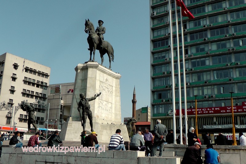 Ankarę i Istambuł w Turcji zwiedzam podczas długiej podróży, która nazwałem: „Zakaukazie i okoliczny Jedwabny Szlak”, w październiku 2012 roku. Wcześniejszą relację znajdziesz tutaj: Turcja południowo -wschodnia. Wjechałem do regionu Anatolii Środkowej ze starożytnej Antiochii , obecnie Antakyi. Mój autobus pokonał odległość od granicy z Syrią do stolicy Turcji przez 10 godzin (ok.700 km). Na dworcu autobusowym od razu kupuję bilet dalej na pojutrze do Istambułu (454 km, 6,5 godziny,24,8 USD). Firma autobusowa Metro odwozi mini busem swoich klientów do centrum miasta obok Placu Ulus. Bezwiednie zaoszczędziłem czasu i kłopotu. Zarezerwowałem sobie przed wyjazdem mały Hoteli Sana w centrum miasta. Mam tylko ok.800 metrów piechotą (płacę 15 EUR). W pobliżu jest mnóstwo innych hoteli różnych klas. Mam na Ankarę mnóstwo czasu więc z okazji niedzieli nieco odpoczywam i ruszam w miasto dopiero ok. 12- tej. Ankara jest także starym miastem, choć jeszcze niedawno małym i bez większego znaczenia. Swój obecny rozwój zawdzięcza strategicznemu położeniu będącej tu bazy wojskowej, w czasie wojny o niepodległość Turcji z początku XX wieku. Ta wtedy mała osada okazała się idealnym miejscem na siedzibę rządu i władz nowo powstałej Republiki Tureckiej. Wyznaczono ulice itd. , by po kilku latach było ludności wielokrotnie więcej, obecnie ponad 4,5 miliona. Zanim Ankara została stolicą tylko raz w czasie swojej historii odegrała równie ważna rolę: w 25 r p.n.e. została stolicą rzymskiej prowincji Galacji, i osiągnęła populację ok. 200 tysięcy mieszkańców. Nosiła kilka nazw: Ankala, lub Ankuwasz, Ancyra, Sebaste. Stolica jest od 13 pażdziernika 1923 r. Miasto położone na Wyżynie Anatolijskiej rozłożone jest na kilku niewielkich wzgórzach. Centralnym miejscem jest Plac Ulus (Plac Ludowy), a jedną z głównych ulic odchodzący z niego Ataturk Blv. W pobliżu znajdują się główne zabytki. Na placu pomnik Zwycięstwa z centralną postacią Ataturka na koniu. Z uwagi na to że jutro (poniedziałek) są nieczynne muzea, dzisiejsza niedzielę przeznaczyłem na odwiedzenie dwóch muzeów i Ankara Kalesi ((twierdza).