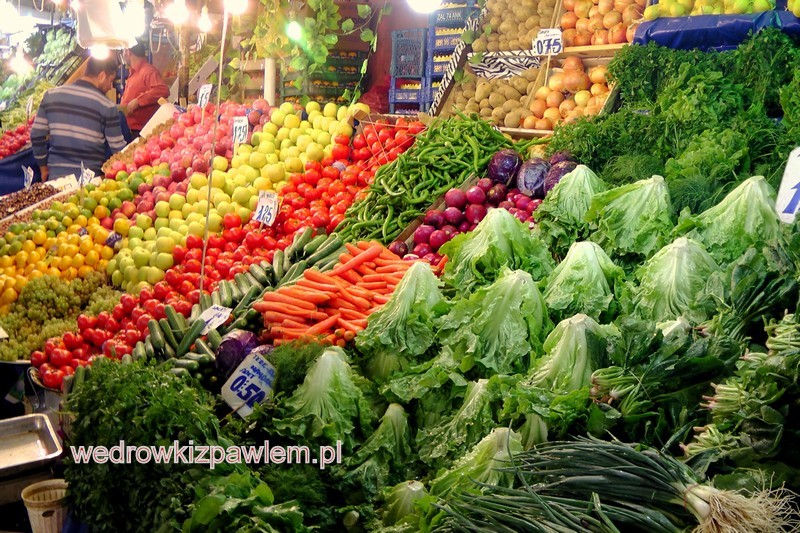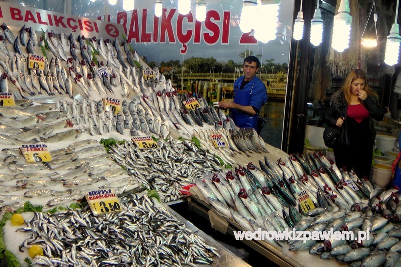 Wracam z powrotem przez bazar spożywczy, w którym podobały mi się okazałe stoiska z warzywami i owocami oraz z… rybami.