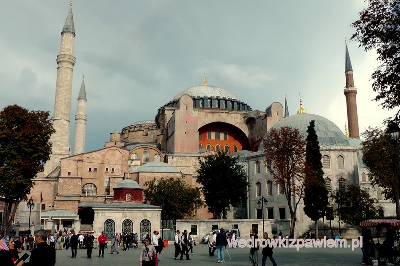 Ale dosyć historii. Zwiedzałem Istambuł przez ostatnie dwa dni mojej wyprawy. Rozpocząłem od sztandarowych pozycji z listy największych zabytków tej „ Bramy Orientu”. Świątynia Mądrości Bożej, Hagia Sofia jest najsłynniejsza. Obecnie kościół- meczet – muzeum (wstęp 13,9 USD), niemiłosiernie prawie rozdeptywany przez tłumy turystów. Dawniej kościół chrześcijański (IV wiek), wielokrotnie przebudowywany po pożarach i trzęsieniach ziemi, by w końcu w czasach osmańskich, stać się meczetem. Liczne groby sułtanów. Mozaiki na ścianach pochodzą z IX wieku i później, gdyż wtedy cofnięto zakaz przedstawiania w świątyniach islamskich postaci ludzkich. Wcześniejsze zostały zniszczone. W środku wspaniałe wnętrze z wysoką kopułą, kolumnami , żebrami i licznymi (170) otworami okiennymi (efekt tajemniczego półmroku). Z lewej strony od wejścia słynna „płacząca kolumna z łzawieniem marmuru, mająca pomagać na impotencje i choroby oczu. Z kilkudziesięciu zdjęć pokazuję tylko dwa.