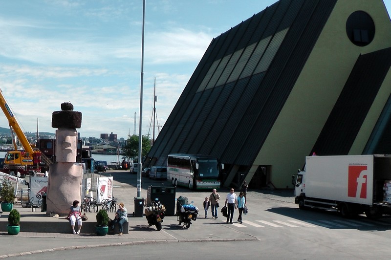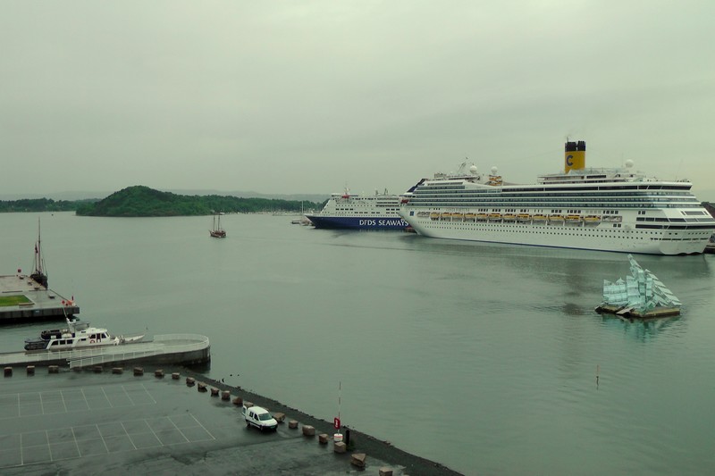 Drugiego dnia chciałem jeszcze popłynąć jeszcze w głąb Fiordu Oslo, ale lało, więc był tylko spacer do opery. Na ten nowoczesny biały budynek, oddany do użytku kilka lat temu, można wejść spacerując dookoła po górę. Zbudowano go na krawędzi fiordu, i widać z niego port i okoliczne wyspy. Miałem okazję spojrzeć z dachu opery na dwa pływające „miasta wycieczkowe”, zacumowane na wprost niej.
